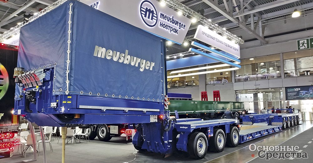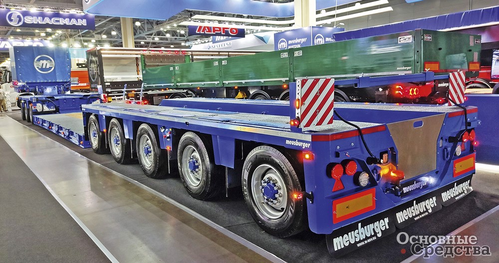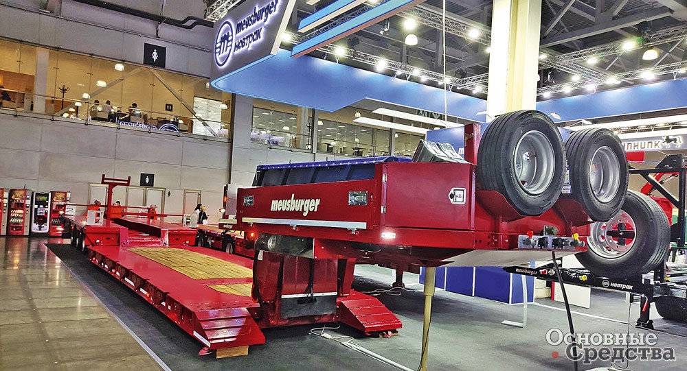 Как и ожидалось, главным экспонатом экспозиции компании «Meusburger Новтрак» из Великого Новгорода стал запущенный в производство тяжелый модульный полуприцеп ТР-8144, эксплуатировать который возможно в сцепке с большинством седельных тягачей 6х4. Преимущество модульности в возможности комбинировать грузовые площадки, передние и задние колесные тележки, гусаки или тяговые устройства в зависимости от размеров, массы и формы крупногабаритного тяжеловесного груза (КТГ). На выставке представили полуприцеп в составе гусака, передняя тележка с 3 осевыми линиями на гидравлической подвеске, низкорамная грузовая площадка, задняя тележка с 5 осевыми линиями. В такой конфигурации на полуприцепе можно перевозить тяжелую технику и оборудование, например трансформаторы. При движении со скоростью до 10 км/ч можно перевозить груз массой до 130 т, на скорости 40 км/ч – 120 т. Минимальная погрузочная высота, когда площадка укладывается на землю, позволяет массивной гусеничной машине безопасно въехать, а регулируемый дорожный просвет проезжать под препятствиями и преодолевать перепады высот. При необходимости площадка раздвигается в длину на 5,8 м. Колесные тележки оснащены управляемыми осевыми агрегатами на гидравлической маятниковой подвеске и парными колесами, таким образом, осевую линию составляют 4 колеса. Гидравлическая подвеска позволяет регулировать дорожный просвет в широком диапазоне и обеспечивает плавное движение. Рулевое управление работает принудительно через ССУ, а также дистанционно при помощи радиопульта. Гидросистема приводится в действие автономным бензиновым двигателем на гуське.