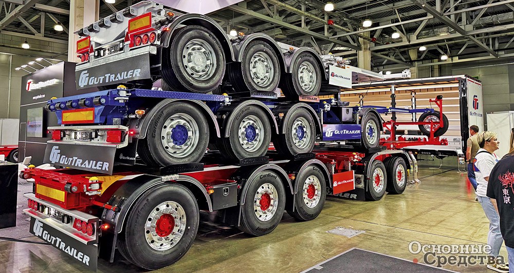 Компания ООО «Гут Трейлер» (г. Великий Новгород) представила под маркой Gut Trailer шесть единиц полуприцепной техники: шторный, полуприцеп-тяжеловоз и контейнеровозы, три из которых были составлены в стопку в цветах российского флага. Шторный 4-осный полуприцеп Jumbo длиной 16,9 м с пониженным уровнем пола и колесами размером 235/75R17.5. Сдвижные шторы и крыша ускоряют начало погрузочно-разгрузочных работ с четырех сторон.