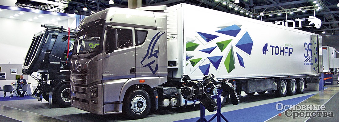 Машиностроительный завод «ТОНАР» из Московской области продемонстрировал комплексные решения для перевозчиков – полуприцепы с магистральными седельными тягачами. Самосвальный 3-осный полуприцеп с двускатной ошиновкой SH3D-33 повышенной грузоподъемности разработан по просьбам заказчиков. Полуприцеп с кузовом вместимостью 33 м3 и снаряженной массой 9500 кг предназначен для эксплуатации с тягачами с колесной формулой 4х2 и 6x4. Заводские конструкторы улучшили распределение нагрузки по осям, увеличив срок службы шин.
