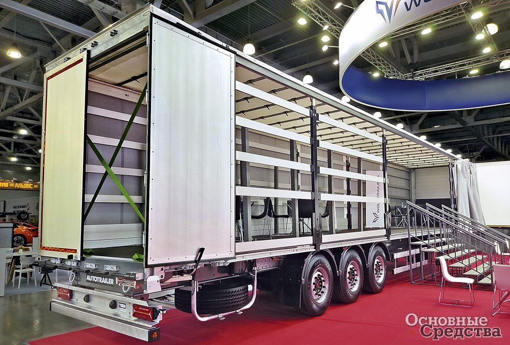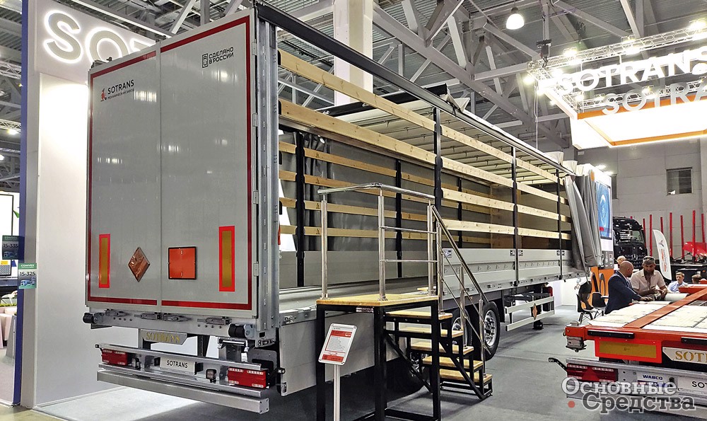 Второй экспонат – локализованный полуприцеп. Эта версия произведена на базе рамы, изготовленной в Турции, с оригинальными осями SAF. Все остальные компоненты конструкции полуприцепа – локализованные. Часть компания изготавливает в России самостоятельно, часть покупает у российских производителей. Это позволяет возмещать до 70% утильсбора с данной модели, снижая ее себестоимость. Он тоже оснащен нестандартными опциями: механизмом подъема крыши, позволяющим удобно загружать высокие палеты, системой очистки крыши от льда и снега, дополнительными ящиками и отсеками для хранения вещей и инструмента.