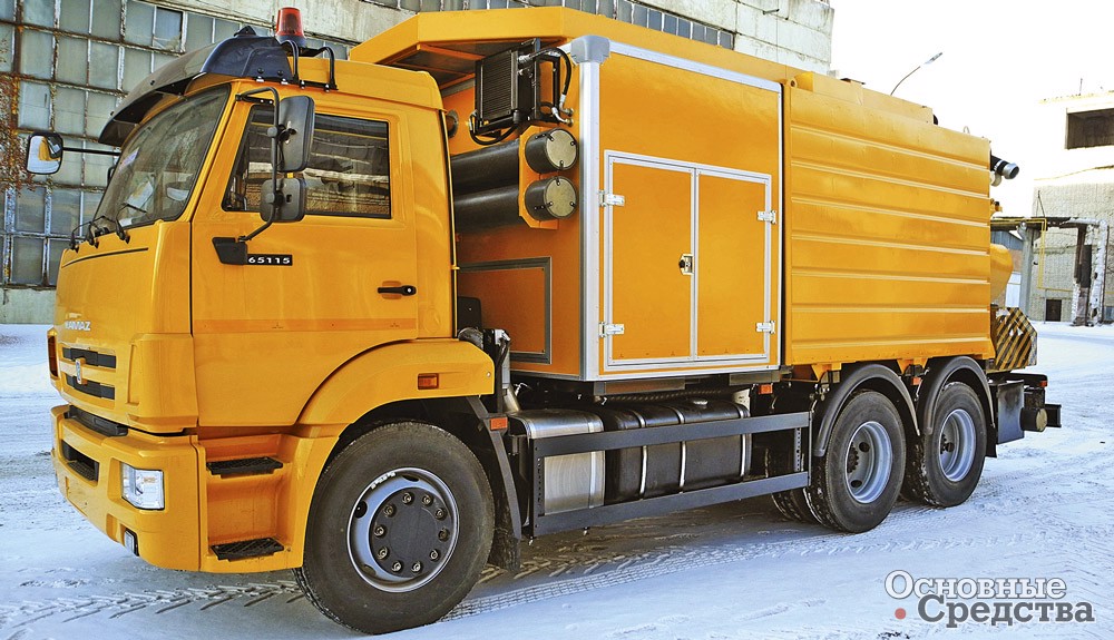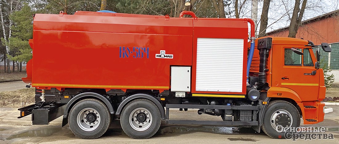«Мценский завод «КОММАШ» выпускает комбинированную каналоочистительную машину КО-564М на шасси КАМАЗ-65115. Машина оснащена оборудованием для размыва и подъема отложений из канализационных колодцев и отстойников, очистки ливневой канализации, фильтров и прифильтровых зон водозаборников, транспортировки ила к месту утилизации и самосвальной выгрузки. Оборудование включает иловую цистерну вместимостью 6 м3 с подъемной крышкой, водяные баки по бокам цистерны общим объемом 5,45 м3, вакуум-насос производительностью 720 м3/ч, который создает разрежение не менее 0,08 МПа, позволяющее поднимать отложения с глубины до 6 м. Водяной насос производительностью 12,7 м3/ч обеспечивает давление до 16 МПа. Машина способна очищать трубопроводы диаметром от 50 до 500 мм. Технологическое оборудование окружено панелями с термоизолирующим материалом, плюс автономный отопитель позволяет работать при температуре до –20 °С.