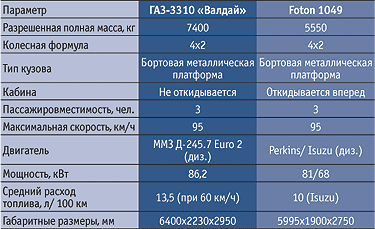 Сравним еще ГАЗ-3310 «Валдай» грузоподъемностью 3,5...5 т и Foton 1049 грузоподъемностью 3 т.