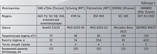 Главное достоинство туймазинских бетононасосов – их дешевизна по сравнению с импортными. Однако на рынке довольно широко представлены импортные автобетононасосы, бывшие в употреблении, которые в 2...3 раза дешевле новых. Основные технические характеристики автобетононасосов некоторых фирм приведены в табл. 1.