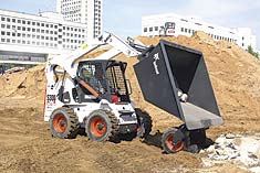 Погрузочный ковш, с которым обычно покупают погрузчик, – далеко не единственный вариант. Значительно более функционален двухчелюстной ковш. Боковые края челюстей снабжены зубчиками, хорошо удерживающими бревно, что и доказал Роби. Погрузчик, оборудованный поворотным отвалом, соперничает с легким бульдозером, но, в отличие от последнего, может применяться для зимнего содержания дорог. При больших объемах земляных работ можно использовать опрокидывающийся бункер-землевоз. В транспортном положении бункер опирается на колеса, а для выгрузки оператор поднимает стрелу и опрокидывает бункер. Конечно, для выгрузки в самосвал такого объемного «ковша» вылета стрелы не хватит.