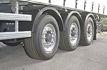На низкорамном полуприцепе в сочетании с LHS-e и LHD+ производитель рекомендует использовать шины модели Marathon LHT 455/40R22,5 или LHT 435/50R19,5. Диаметр всех указанных шин менее 1 м: у LHS-e он составляет 928 мм, у LHD+ чуть меньше – 926 мм, диаметр шин полуприцепа – 936 мм. Такой размер колес позволяет добиться, чтобы высота грузовой платформы полуприцепа над дорогой была минимальной, а габаритная высота фуры вместимостью 100 м3 укладывалась в требуемые стандартом 3 м. Еще один важный момент: при таком уменьшении диаметра колес необходимо добиться приемлемого для обеспечения эффективного торможения размера тормозных механизмов. Именно низкий профиль 22,5-дюймовых шин позволяет скомпоновать колеса малого диаметра и дисковые тормоза увеличенного размера по сравнению с теми, которые предназначены для 19,5-дюймовых колес. Всего в настоящее время концерн Good Year выпускает шины серии Marathon LHS одиннадцати размеров.