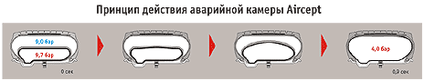 Еще одна интересная новинка шин Greatec – аварийная камера Aircept, которая при проколе играет ту же роль, что подушка безопасности в салоне. При обычной эксплуатации камера Aircept представляет собой баллон высокого давления 9,7 бар, который находится в шине и опоясывает обод колеса, как обычная камера. В отличие от обычной камеры Aircept занимает не всю внутренность шины, а примерно 50%. Остальное – полость между внутренней поверхностью шины и внешней поверхностью Aircept, заполненная воздухом с давлением, немного меньшим, чем внутри Aircept: 9 бар. В случае прокола шины воздух из «внешней» полости выходит, а Aircept за счет высокого внутреннего давления почти мгновенно (примерно за 0,9 с) раздувается и заполняет собой все внутреннее пространство шины. В результате проколотая шина автоматически превращается из бескамерной в камерную, с более низким, но позволяющим доехать до места ремонта внутренним давлением около 4 бар.