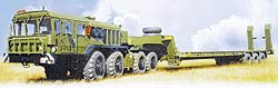 Во многом этому способствует и трехступенчатая гидромеханическая коробка передач (ГМП) с блокируемым гидротрансформатором. ГМП агрегатируется с двухступенчатой раздаточной коробкой, передающей крутящий момент на ведущие мосты посредством карданных валов. Привод всех колес, укомплектованных шинами размерности 18.00-24, выполнен постоянным. Подвеска четырех передних колес независимая. Она включает поперечные рычаги, торсионные упругие валы и гидравлические амортизаторы. Зато два задних моста связаны с рамой только с помощью продольных балансиров, и это дает возможность увеличить нагрузку на седло. В рулевое управление включен мощный гидравлический усилитель, а тормозная система снабжена раздельным пневмогидравлическим приводом. Просторная кабина вмещает экипаж из шести человек. Задний ряд сидений легко трансформируется в два спальных места. Система отопления снабжена парой независимых обогревателей. За дополнительную плату можно получить кондиционер. В результате появилась возможность эксплуатации автомобиля в климатических условиях с перепадами температур от –50 до +50 °С. Высокую профильную проходимость обеспечивает полуметровый дорожный просвет. Неудивительно, что автомобили могут преодолевать брод глубиной 1,1 м.