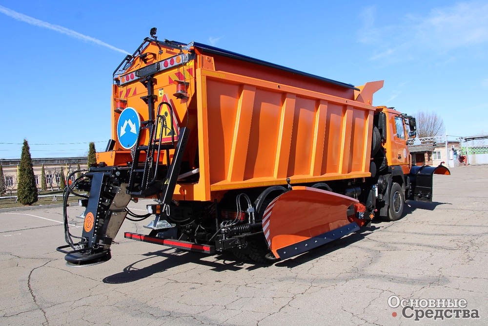 Эта машина оснащена быстросъемным распределителем ПСР-13К, вмещающим до 13,8 м3 противогололедных материалов. Транспортер в кузове выполнен с применением цепи литого исполнения. Разбрасыватель оснащен функцией ассиметрии и имеет регулировку по высоте и ширине распределения ПГМ. Диск и приемный кожух изготовлены из нержавеющей стали.