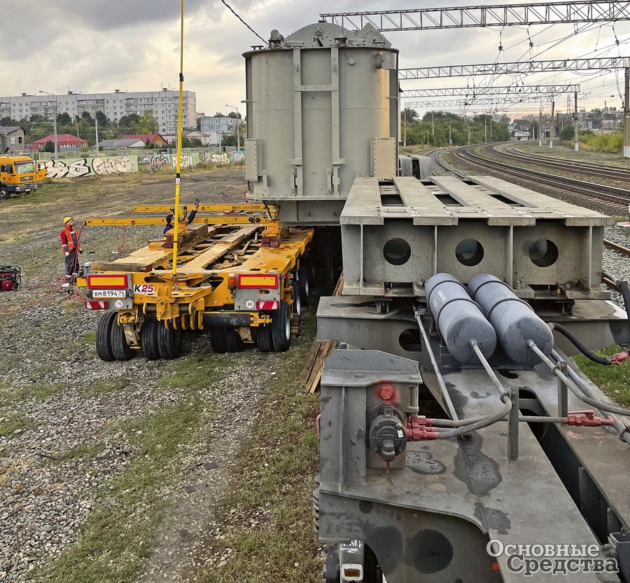 При погрузке, выгрузке и перемещении крупногабаритного оборудования с одного транспортного средства на другое применяются одни и те же технологии. В качестве примера мы рассмотрим перегрузку с железнодорожной платформы на трал. В железнодорожном тупике предприятия или электростанции обычно можно выровнять уровень рельсов и дорожного полотна с помощью плит, бруса, щебня или бетона. Это облегчает задачу: достаточно поднять перевозимое оборудование над железнодорожной платформой, подождать, пока на ее место встанет автотрал, а затем опустить на него груз.