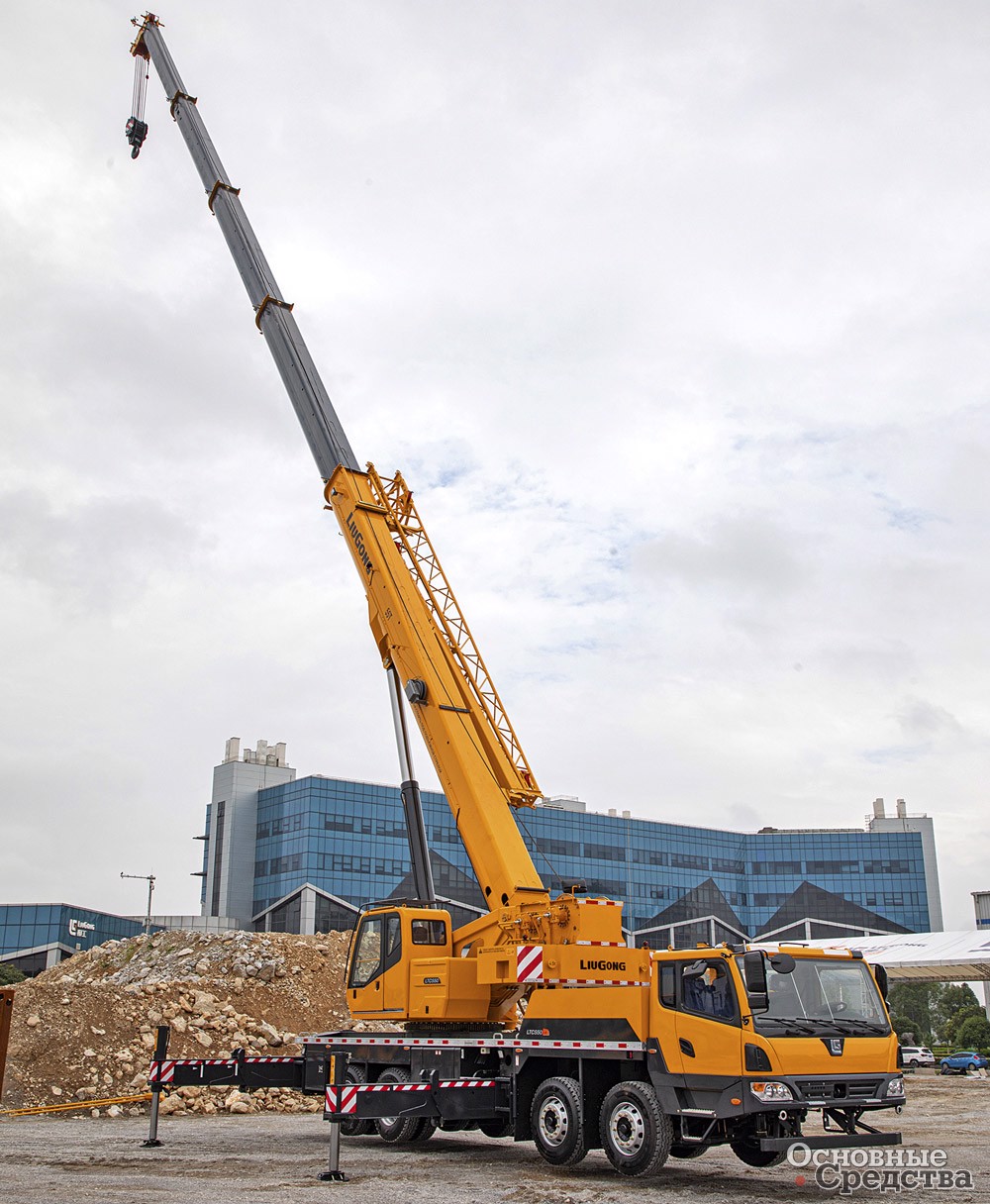 Сегодня компания LiuGong поставляет линейку дорожных кранов на автомобильных шасси с интегрированной опорно-ходовой рамой грузоподъемностью 25, 32, 55 и 75 т на 3- и 4-осных шасси. Так, модель LTC320L5 грузоподъемностью 32 т на 3-осном дорожном шасси автомобильного типа оснащена 5-секционной стрелой сложного U-образного профиля. Длина полностью выдвинутой стрелы достигает 44 м, со штатным решетчатым гуськом – 53 м. Крановая установка и шасси приводятся общим двигателем Dongfeng Cummins мощностью 221 кВт. Масса автокрана – 33,5 т.