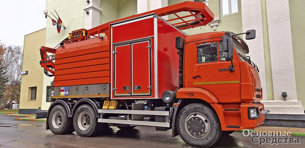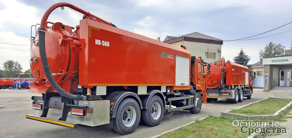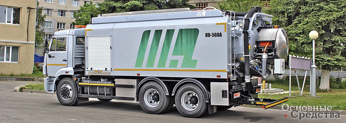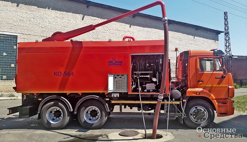 «Мценский завод «КОММАШ» выпускает комбинированную каналоочистительную машину КО-564М на шасси КАМАЗ-65115. Машина оснащена оборудованием для размыва и подъема отложений из канализационных колодцев и отстойников, очистки ливневой канализации, фильтров и прифильтровых зон водозаборников, транспортировки ила к месту утилизации и самосвальной выгрузки. Оборудование включает иловую цистерну вместимостью 6 м3 с подъемной крышкой, водяные баки по бокам цистерны общим объемом 5,45 м3, вакуум-насос производительностью 720 м3/ч, который создает разрежение не менее 0,08 МПа, позволяющее поднимать отложения с глубины до 6 м. Водяной насос производительностью 12,7 м3/ч обеспечивает давление до 16 МПа. Машина способна очищать трубопроводы диаметром от 50 до 500 мм. Технологическое оборудование окружено панелями с термоизолирующим материалом, плюс автономный отопитель позволяет работать при температуре до –20 °С.