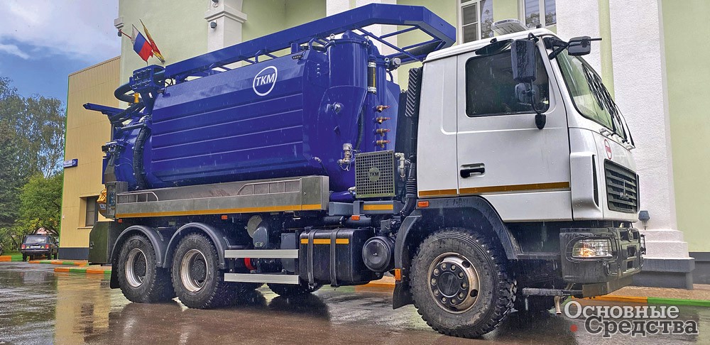 Так, модель ТКМ-530 на шасси МАЗ-6312 6х4 с 14-кубовой цистерной предназначена для сбора и вывоза большого объема иловых отложений, например, при очистке городских водоемов. Цистерна разделена на два объема для ила и размывочной воды – 14 и 4 м3 либо 11 и 3 м3. Разрежение в иловом отсеке не менее 0,09 МПа создает вакуум-насос производительностью 2600 м3, который позволяет поднимать отложения с глубины до 18 м. Ил закачивают через поворотную стрелу либо через задвижку на задней крышке цистерны. Опционально на машину ставятся либо катушки с 50 метрами всасывающего рукава, либо верхняя кассета с 18 метрами рукава. Осадок из цистерны удаляется при помощи гидросмыва и/или поднятия цистерны. Вакуум-насос может работать одновременно с водяным насосом, обеспечивающим давление до 200 Bar. В комплект входит размывочный рукав длиной до 120 м.