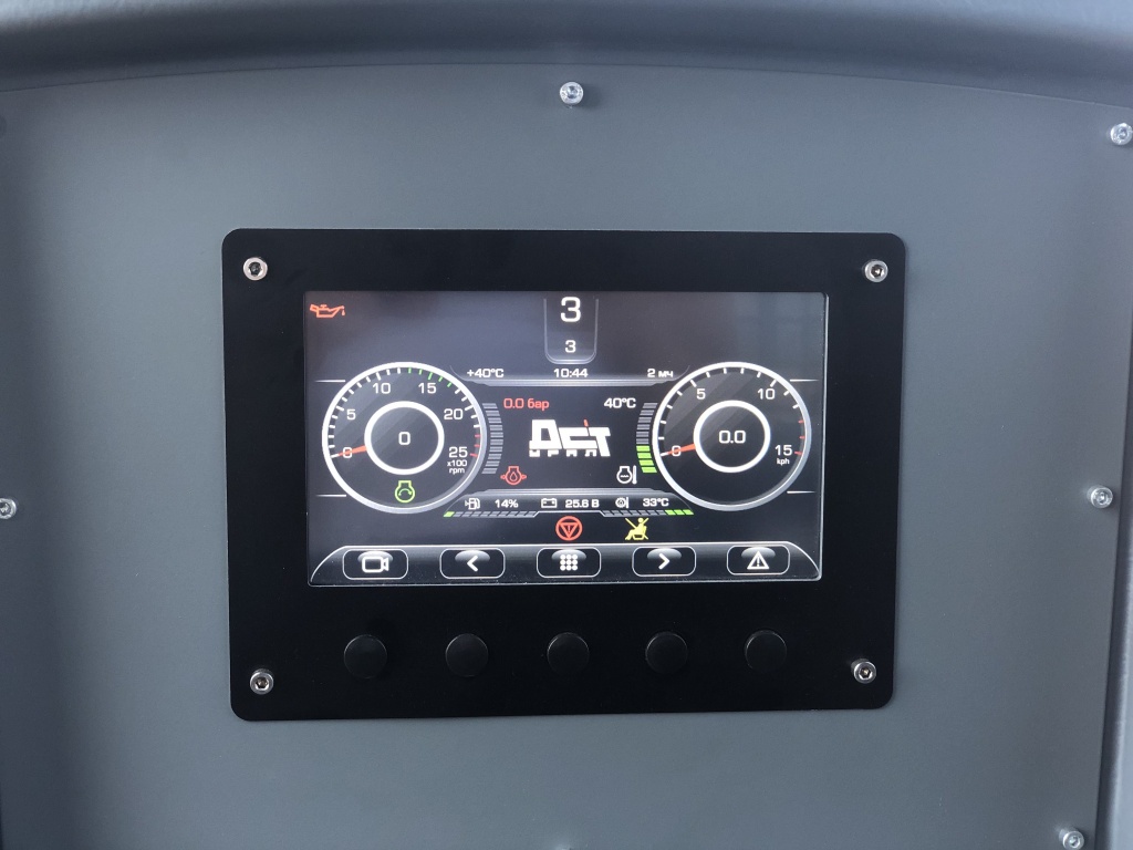 На втором поколении техники ДСТ-УРАЛ место оператора стало не только комфортнее, но и умнее: для кабины разработан собственный экран диагональю 7 дюймов, с сенсорным управлением (тачскрин), софтом и визуализацией. На дисплее отображаются все необходимые приборы, показания датчиков, наработка, сервисная информация. Можно настраивать различные элементы управления: плавность джойстиков, педали, громкость сигналов, яркость, количество взмахов стеклоочистителя, экорежим работы машины и пр.
