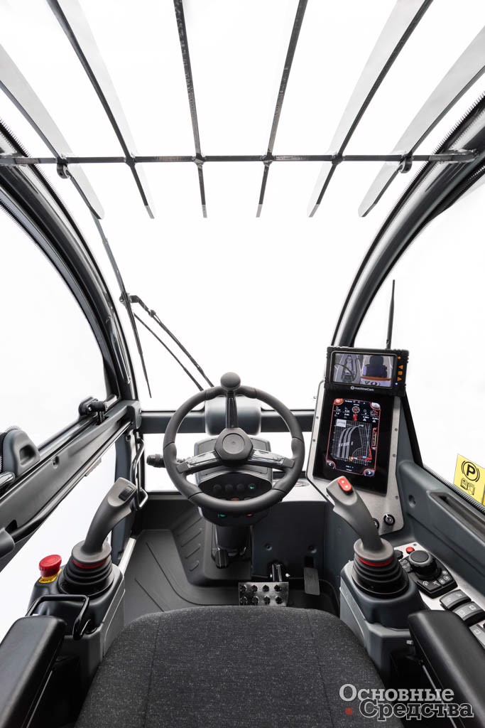 Кабина также оснащена широким набором оборудования, предназначенного для повышения комфорта. Так, её запатентованная конструкция включает в себя систему нагнетания избыточного давления и полнопоточной фильтрации воздуха, а также кондиционер, что позволяет работать в непростых погодных и экологических условиях. Полностью остекленная корзина машины смещена вбок, что обеспечивает оператору превосходный обзор. В то же время большой и яркий сенсорный дисплей, интуитивно понятные органы управления, сертифицированные системы защиты ROPS/FOPS, легко регулируемая рулевая колонка, а также удобное, полностью настраиваемое сиденье делают управление машиной простым и безопасным.
